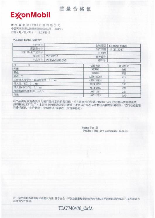 图4  美孚产品质量合格证